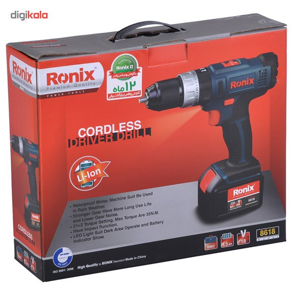 دریل پیچگوشتی چکشی مدل «8618» از جمله محصولات شرکت «رونیکس» (Ronix) محسوب میشود که با یک باتری لیتیومی کار میکند. این باتری با ولتاژ 18 ولت انرژی مورد نیاز موتور دستگاه را تامین کرده است. موتور این دستگاه به یک گیربکس دو وضعیتی مجهز است و در هر وضعیت بازه سرعت گردش موتور تغییر میکند. در حالت اول سرعت گردش بین 0-400 دوربردقیقه و در وضعیت 2 سرعت گردش موتور بین 0-1500 دوربردقیقه متغیر است. سرعت پایینتر مناسب پیچگوشتی و دریل کاری سبک بوده درحالیکه سرعت بالاتر بهمنظور دریل کاری با سرعت بالا مورداستفاده قرار میگیرد. گشتاور موتور این محصول در 21 حالت مختلف قابل تنظیم بوده و در بیشترین مقدار به 35 نیوتنمتر میرسد. با کمک قابلیت تنظیم گشتاور میتوانید میزان نیروی وارده به سهنظام را تغییر دهید. سهنظام این دریل 10 میلیمتری، از نوع خودکار است. سیستم گردش چپگرد و راستگرد برای این محصول باعث میشود در حالت پیچگوشتی، بهراحتی پیچها را باز و بسته کنید و در حالت دریل، ورود و خروج مته را با سهولت بیشتری انجام دهید. ظرفیت باتری این دستگاه 1.5 آمپرساعت است. برای افزایش طول عمر باتری، شارژر دستگاه را به سیستم قطع هوشمند مجهز کردهاند است. زیر سهنظام دستگاه یک LED تعبیه شده است. این لامپ LED در هنگام کار روشن میشود و محل موردنظر را بهخوبی روشن میکند. امروزه دریلها و پیچگوشتیهای برقی و شارژی کاربرد بسیار زیادی در صنعت، کارگاهها و حتی منازل دارند. تفاوت اصلی این دو محصول در سرعت گردش آزاد آنها است. در طی چند سال اخیر شرکتها برای پاسخ به نیاز کاربران این دو محصول را باهم ترکیب کردهاند. شما با کمک این ابزار میتوانید از ویژگی دریل و پیچگوشتی بهطور همزمان بهرهمند شوید. شرکت رونیکس سالها است که درزمینهی عرضهی ابزارآلات دستی و برقی فعالیت میکند. این شرکت علاوه بر حفظ کیفیت محصولاتش، آنها را باقیمتی مناسب روانهی بازار میکند.
