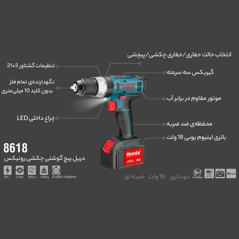 دریل پیچگوشتی چکشی مدل «8618» از جمله محصولات شرکت «رونیکس» (Ronix) محسوب میشود که با یک باتری لیتیومی کار میکند. این باتری با ولتاژ 18 ولت انرژی مورد نیاز موتور دستگاه را تامین کرده است. موتور این دستگاه به یک گیربکس دو وضعیتی مجهز است و در هر وضعیت بازه سرعت گردش موتور تغییر میکند. در حالت اول سرعت گردش بین 0-400 دوربردقیقه و در وضعیت 2 سرعت گردش موتور بین 0-1500 دوربردقیقه متغیر است. سرعت پایینتر مناسب پیچگوشتی و دریل کاری سبک بوده درحالیکه سرعت بالاتر بهمنظور دریل کاری با سرعت بالا مورداستفاده قرار میگیرد. گشتاور موتور این محصول در 21 حالت مختلف قابل تنظیم بوده و در بیشترین مقدار به 35 نیوتنمتر میرسد. با کمک قابلیت تنظیم گشتاور میتوانید میزان نیروی وارده به سهنظام را تغییر دهید. سهنظام این دریل 10 میلیمتری، از نوع خودکار است. سیستم گردش چپگرد و راستگرد برای این محصول باعث میشود در حالت پیچگوشتی، بهراحتی پیچها را باز و بسته کنید و در حالت دریل، ورود و خروج مته را با سهولت بیشتری انجام دهید. ظرفیت باتری این دستگاه 1.5 آمپرساعت است. برای افزایش طول عمر باتری، شارژر دستگاه را به سیستم قطع هوشمند مجهز کردهاند است. زیر سهنظام دستگاه یک LED تعبیه شده است. این لامپ LED در هنگام کار روشن میشود و محل موردنظر را بهخوبی روشن میکند. امروزه دریلها و پیچگوشتیهای برقی و شارژی کاربرد بسیار زیادی در صنعت، کارگاهها و حتی منازل دارند. تفاوت اصلی این دو محصول در سرعت گردش آزاد آنها است. در طی چند سال اخیر شرکتها برای پاسخ به نیاز کاربران این دو محصول را باهم ترکیب کردهاند. شما با کمک این ابزار میتوانید از ویژگی دریل و پیچگوشتی بهطور همزمان بهرهمند شوید. شرکت رونیکس سالها است که درزمینهی عرضهی ابزارآلات دستی و برقی فعالیت میکند. این شرکت علاوه بر حفظ کیفیت محصولاتش، آنها را باقیمتی مناسب روانهی بازار میکند.