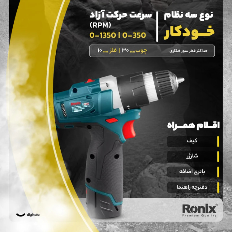 موتور قدرتمند با حداکثر گشتاور30NM مناسب انواع کاربرد دریل کاری و بازوبستن پیچها و سه نظام تمام اتوماتیک 10mm با پوشش فلزی برای افزایش مقاومت گیربکس فلزی بادوام 2 سرعته به همراه تورکمتر 1+18 حالته مناسب حالات مختلف کاری باتری پرقدرت لیتیومی 5Ah و12V با قابلیت شارژ سریع و نشانگر شارژ باتری بدنه سبک و ارگونومیک برای سهولت استفاده به همراه چراغ قوه LED برای تامین روشنایی محل کار به همراه گیره آویز فلزی گارانتی 12 ماهه رونیکس